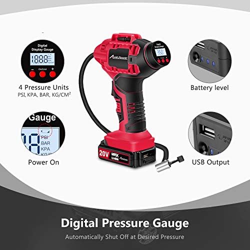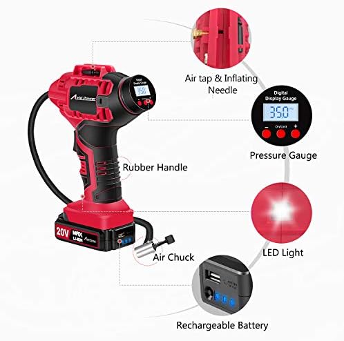 AVID POWER Tire Inflator Air Compressor, 20V Cordless Car Tire Pump with Rechargeable Li-ion Battery, 12V Car Power Adapter, Digital Pressure Gauge