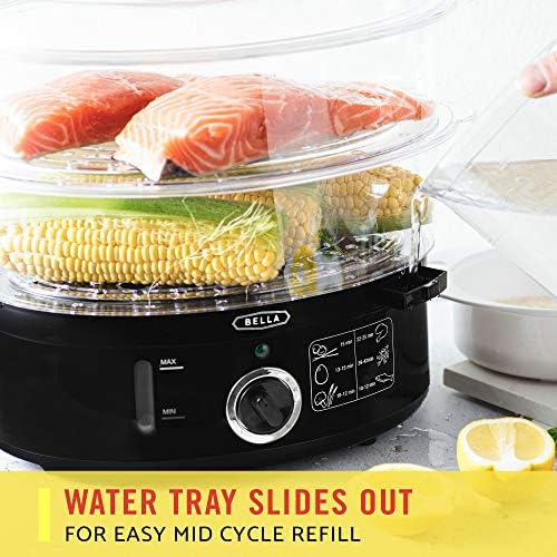 BELLA Two Tier Food Steamer, Healthy, Fast Simultaneous Cooking, Stackable Baskets for Vegetables or Meats, Rice/Grains Tray, Auto Shutoff & Boil Dry Protection, 7.4 QT, Black