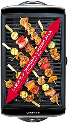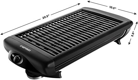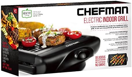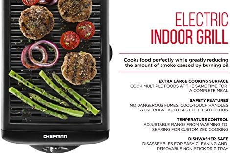 The Chefman Indoor Grill produces less smoke than traditional indoor grills, so you can enjoy perfectly grilled food year-round without having to stand in the cold. With an extra-large 150 SQ. inch cooking surface you can cook multiple foods at the same time for a complete meal. Temperature control knob goes from warm to sear, for cooking a variety of food; corn, zucchini, tomatoes, burgers, steak, chicken, fish and more!