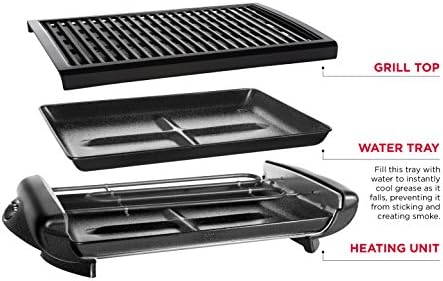 To achieve that perfectly smoke-free grilling indoors, the water tray must be filled with water between the minimum and maximum line. The water instantly cools the grease that falls on it, preventing it from sticking to the tray or from smoking. To add additional water to the tray during cooking, partially remove the tray using the handle – do not pour water directly over the grill plate. For added safety, this unit boasts cool-touch handles, and overheat auto shut-off protection. The grill disassembles so you can easily clean the grill and removable water tray by hand or in your dishwasher, making clean up as easy as grilling!