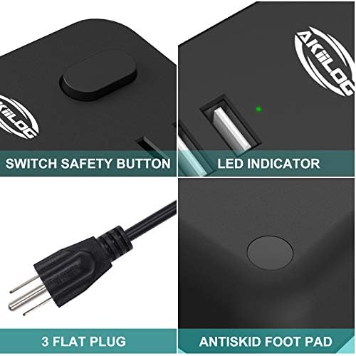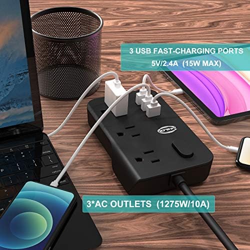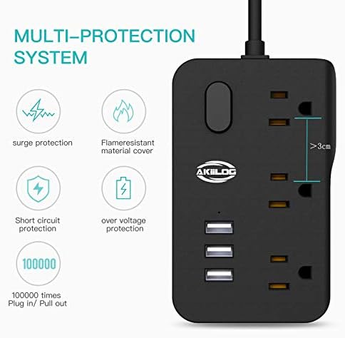 Power Strip with 5ft Extension Cords, AKiiLOG Power Surge Protector 3AC outlets 3 Fast Charging USB, Multi Plug Home Appliances Laptop and Phones, 1275W/10A, Max 15W for USB— Black